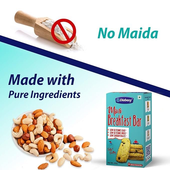 Diabexy mini breakfast bar is a completely healthy & diabetic friendly snack. It has 0% sugar with a low glycemic load and low carbohydrate content. If you are looking for healthy and sugar free snacks for diabetics, then this breakfast bar is the best option for you. It is a combination of both healthy and energy bars.