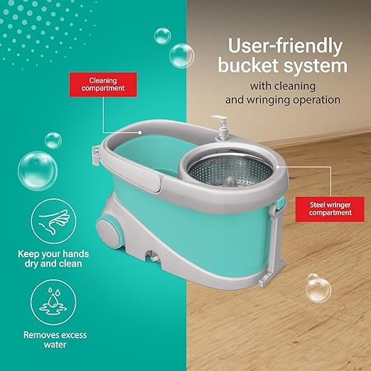 | CLASSIC SPIN MOP | Microfiber Cleaning Technology: Durable, Superior Water Absorbency, Non Abrasive Lint Free, Larger Surface Area, Environment Friendly Usage – Wet & Dry Both Easy to Use, Store & Carry Oval Bucket with Drainage Separate Cleaning & Wringing Operation Extendable Mop Handle 360° Movement Bucket Handle – To Lift the Bucket Cleans Liquid, Oil, Dust, Hair & Bacteria Side Bucket Handle – To Slide The Bucket On Wheels Multipupose Use |